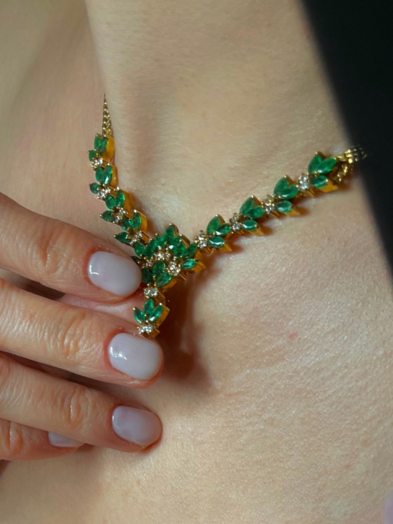Złoty naszyjnik z naturalnymi brylantami i szmaragdami.